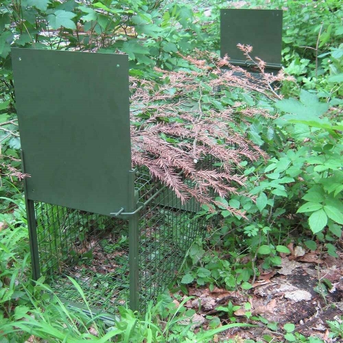 Past je izdelana iz pocinkane žične mreže in dodatno prašno barvana v zeleno barvo, kar zagotavlja dolgo življenjsko dobo. Debelina žice približno 2 mm in velikost mrežnih odprtin 2,5 cm zagotavljata stabilnost in trpežnost brez kompromisov pri funkcionalnosti. Trdna konstrukcija omogoča, da past prenese obremenitve pri vsakodnevni uporabi in ostane učinkovita skozi daljše obdobje.